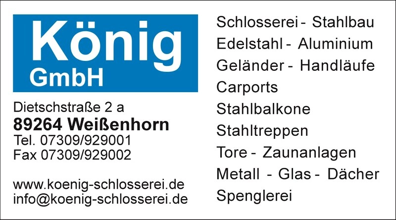 Telefon: 07309/929001 Fax: 07309/929002 Website: www.koenig-schlosserei.de E-Mail: info@koenig-schlosserei.de